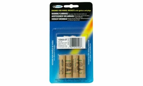 The Estes 1/2A3-2T engine is single stage engine designed for model rocket flight. This engine is a mini engine designed for flights in lightweight rockets. Each package includes 4 engines, 4 igniters and 4 igniter plugs.