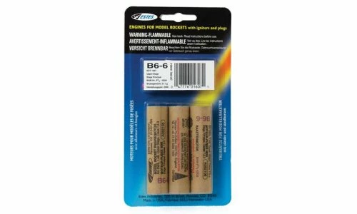 The Estes B6-6 engine is an upper stage engine designed for model rocket flight. This engine can also be used as a single stage engine in lightweight rockets. Each package includes 3 engines, 3 igniters and 4 igniter plugs.