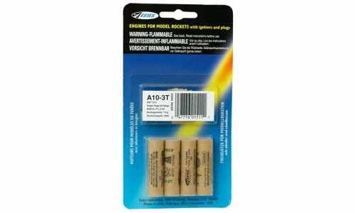 The Estes A10-3T engine is single stage engine designed for model rocket flight. This engine is a mini engine designed for flights in lightweight rockets. Each package includes 4 engines, 4 igniters and 4 igniter plugs.