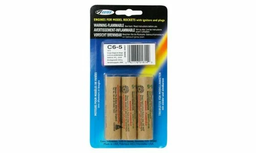 The Estes C6-5 engine is a single stage engine designed for model rocket flight. This engine is a standard engine designed for flights in rockets weighing less than 4 ounces, including the engine. Each package includes 3 engines, 3 igniters and 4 igniter plugs.