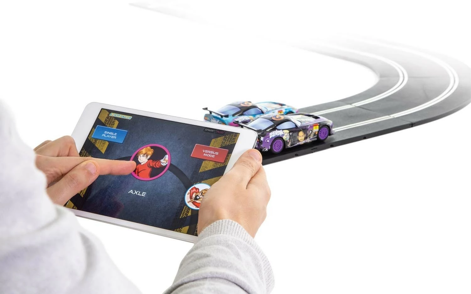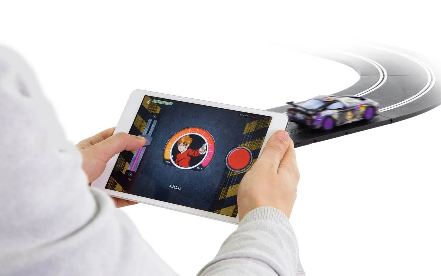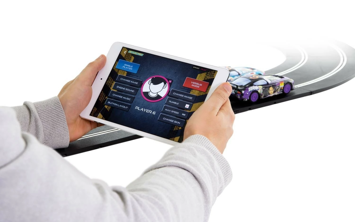 “You can now control your Scalextric car with your phone!” Spark Plug is the latest innovation from Scalextric which allows you to race your car using your Android or IOS smart device. Simply plug the Spark Plug dongle into your Scalextric powerbase rather than a traditional hand controller, download the app and race away meaning no more wires! Other in app features include: • Single Player or Versus Mode options. • Option to use smart device vs hand controller on single player option. • Function to BOOST your own and RESTRICT your opponents speed. • Rumble and sound effects. Personalise your race profile within app and racing experience: • Name. • Include your image from your library or camera. • Controller skin. • Select music from either the app or your own library. • Engine sound • Button layout – right handed or left handed option. Scalextric Spark Plug is compatible with Scalextric 1:32 scale power bases. The app works with most Android and IOS devices, and can be downloaded from the app store.