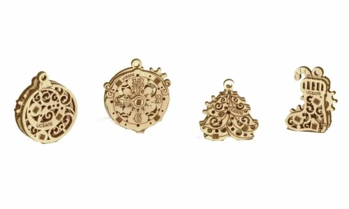 The unique 4 sets of the individual miniature Ugears models: Ball, Clock, Shoe, Christmas Tree. Perfect addition to your Christmas tree.